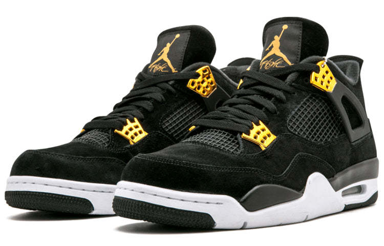 The Air Jordan 4 Retro 'Royalty' sneakers are the perfect blend of style and comfort. The black suede upper and metallic gold accents give these shoes a luxurious look, while the polyurethane midsole provides lightweight cushioning. The herringbone traction pattern on the rubber outsole ensures optimum grip, making these shoes ideal for both casual and athletic wear.