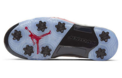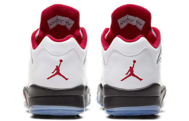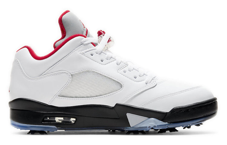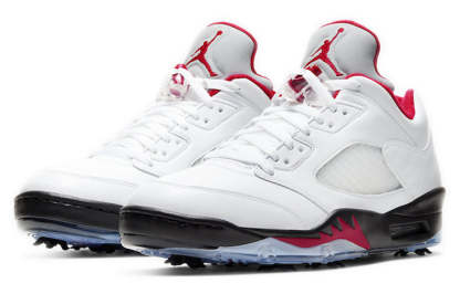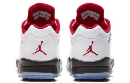 Originally designed for the hardwood, the Air Jordan 5 Low Golf ‘Fire Red’ brings the classic Jordan look to the green. This shoe features a white leather upper with all the signature details of the original Air Jordan 5, including lace locks, a reflective silver tongue and quarter panel netting. A contrasting black foam midsole with red shark tooth detailing and a visible Air sole unit at the heel provides cushioning and traction for your game. The removable spikes deliver enhanced traction on any golf course.
