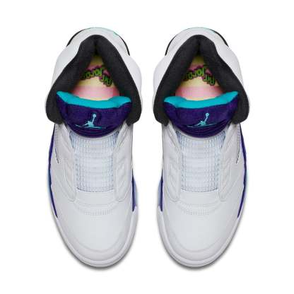 The Air Jordan 5 Retro NRG 'Fresh Prince' is a special edition sneaker released in celebration of Will Smith's 50th birthday. The sneaker is inspired by the laceless AJ5 model that Smith wore on the set of The Fresh Prince of Bel-Air, and features a vibrant Grape Ice and New Emerald colorway. The design also includes a nod to the show's title sequence graffiti on the insole.
