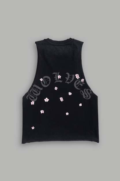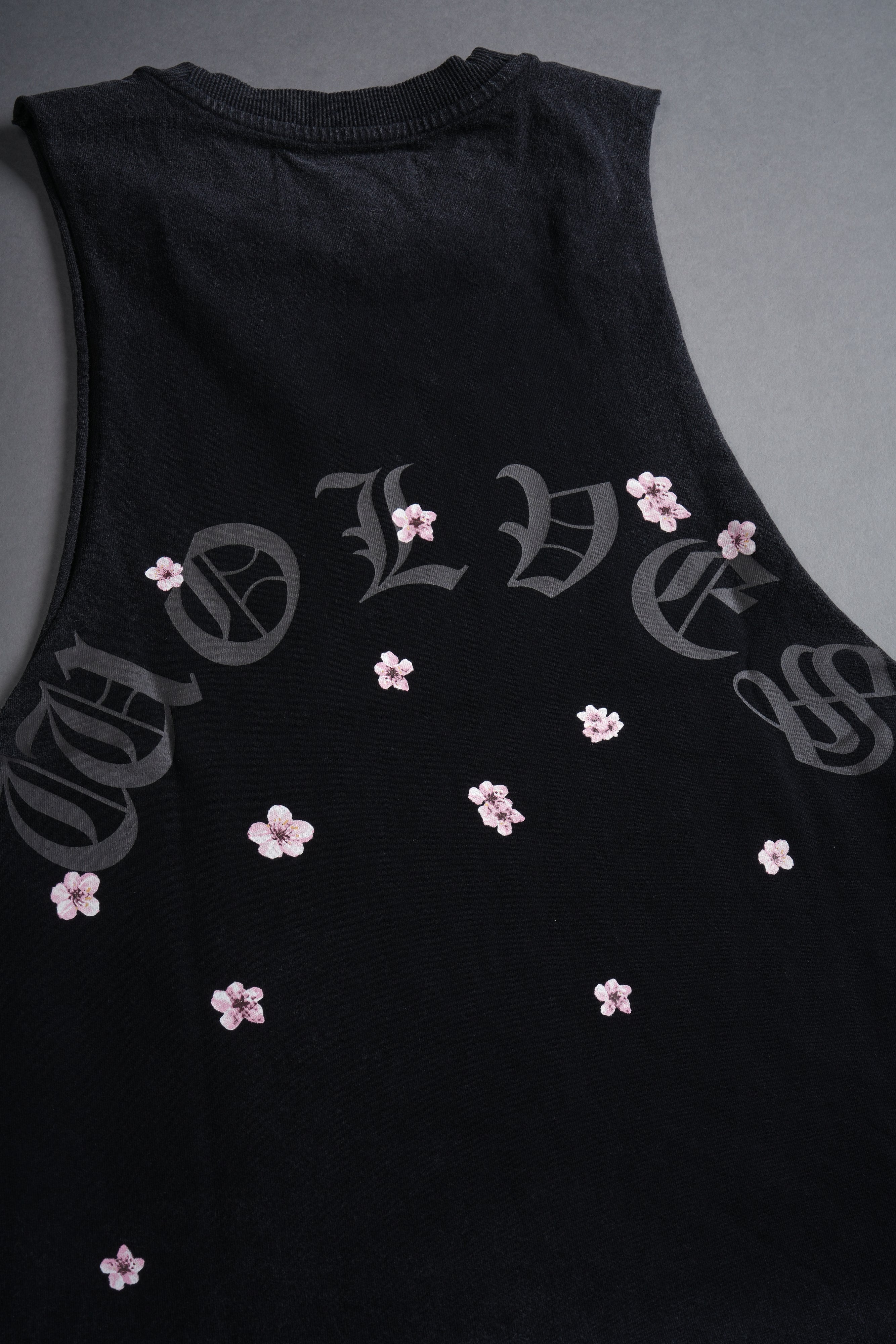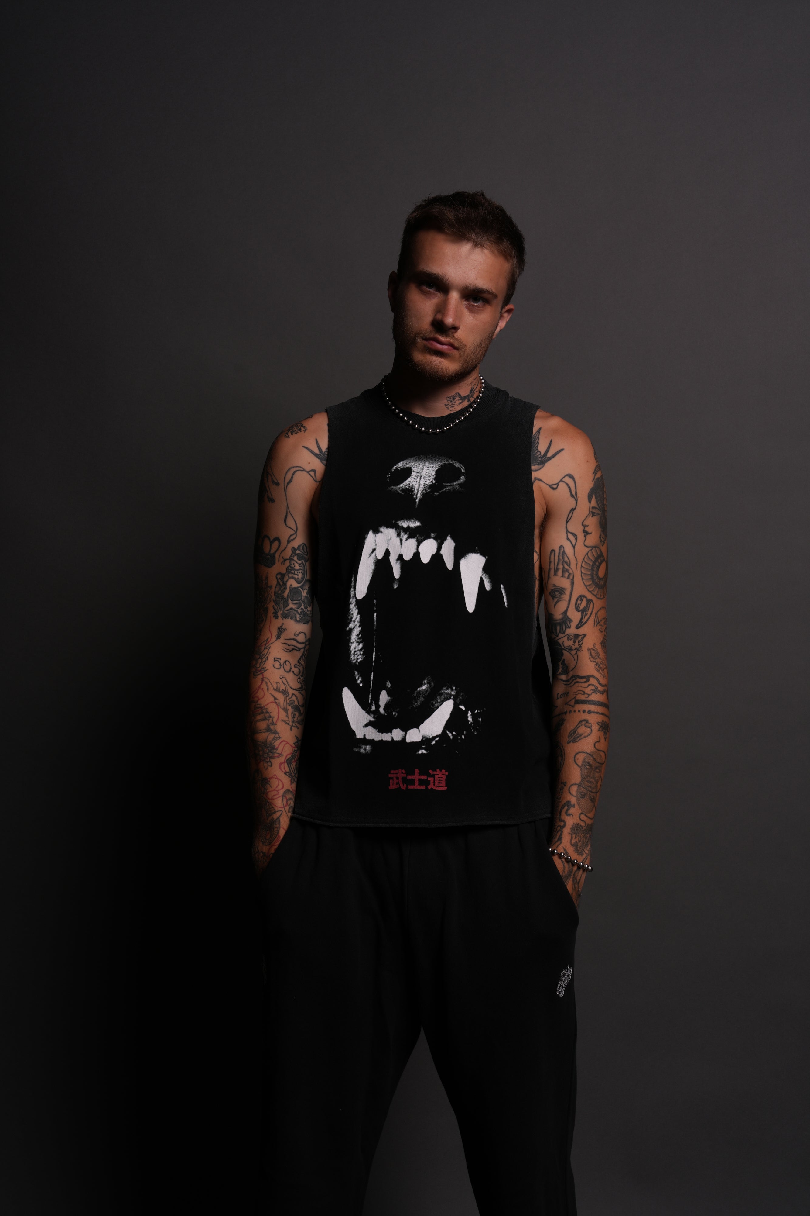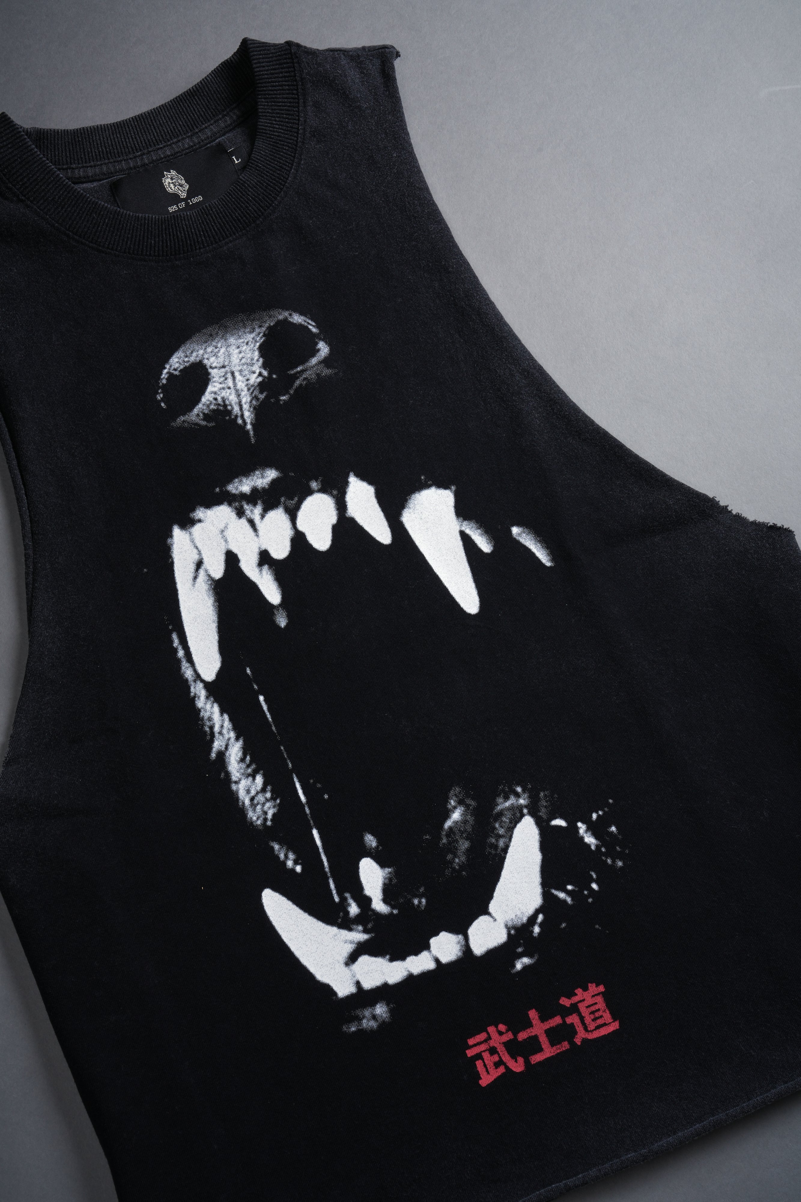Blood Thirsty Kanji Grunge Raw Cropped "Tommy" Muscle Tee in Black