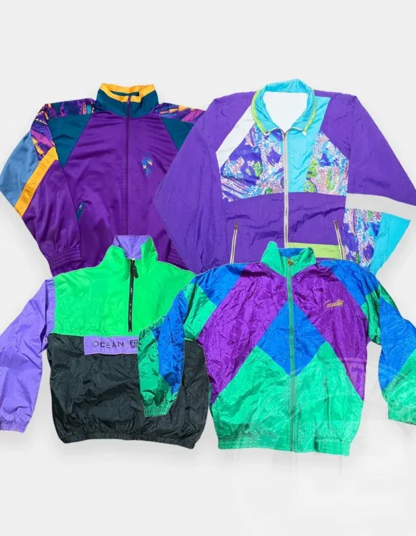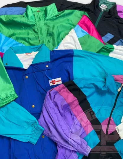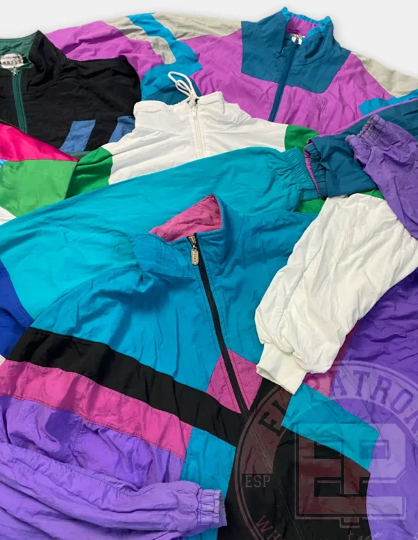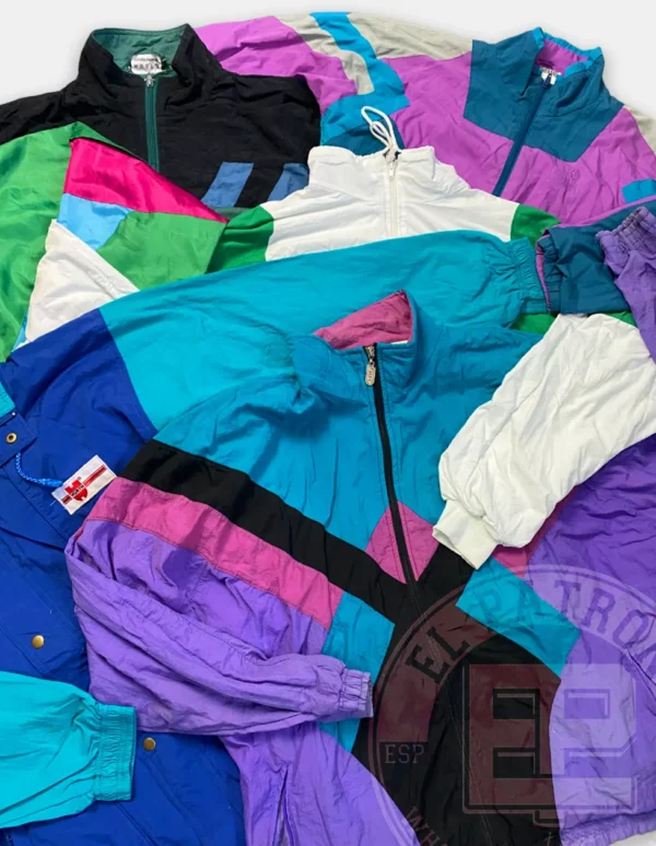 Lote de chaquetas crazy ligeras con colores vibrantes y estilo retro característico de los años 80-90. Corte deportivo y oversize. Muchas prendas con logos bordados.