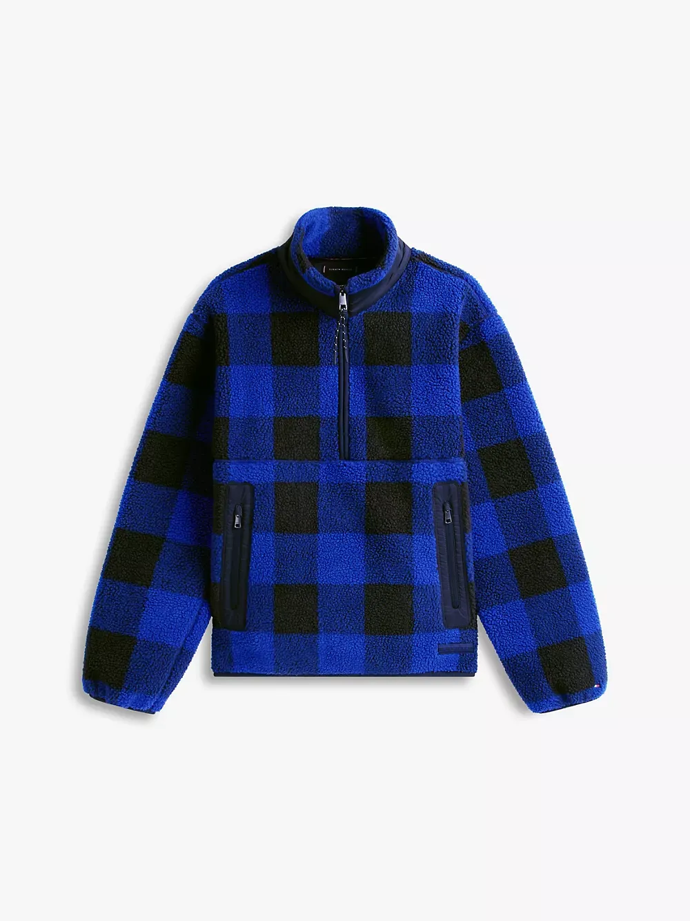 - Quarter-zip placket, stand collar, side zip pockets.