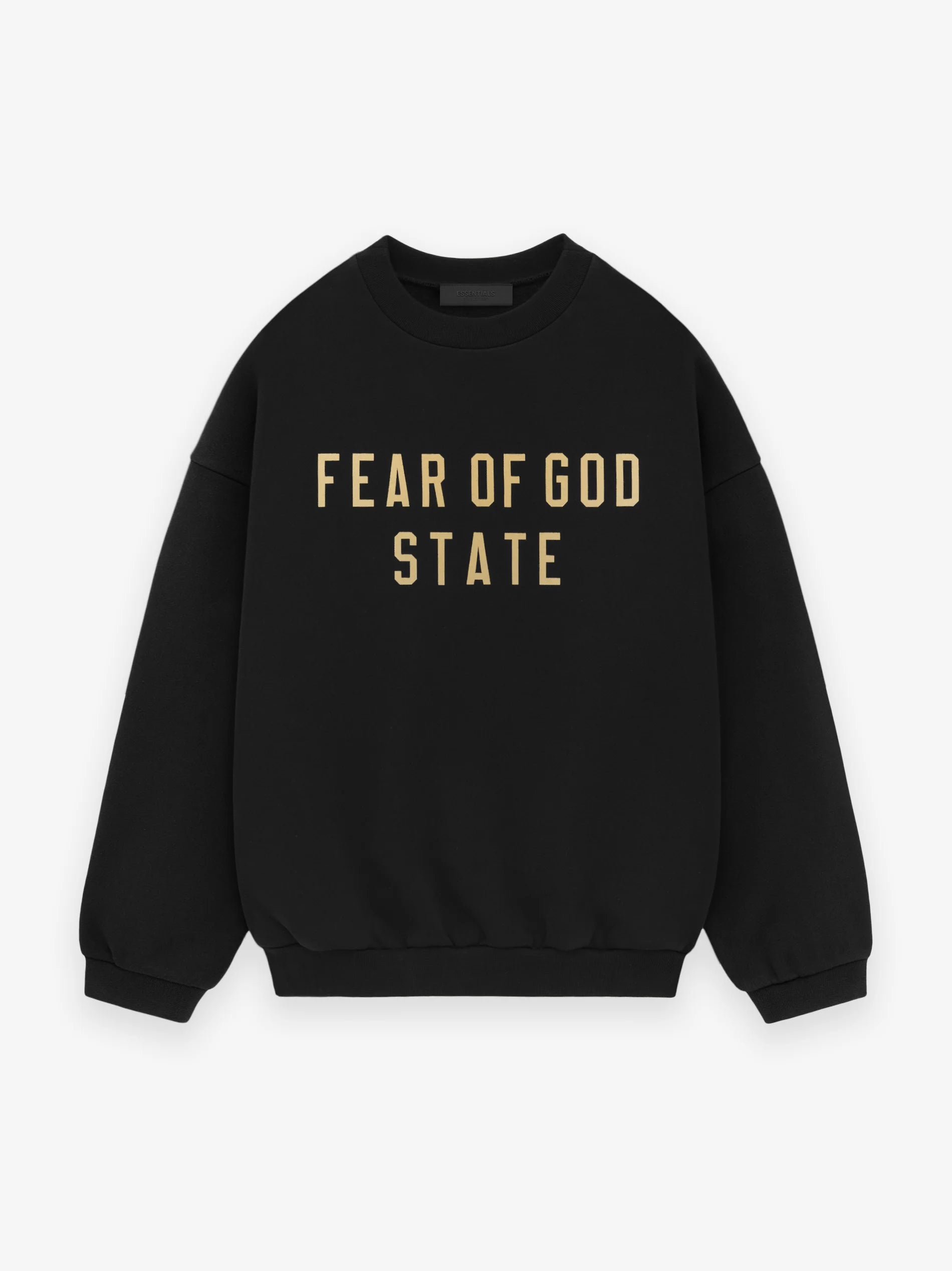 The Essentials Fleece Crewneck has been updated in a heavier 480gsm core fleece to provide additional body and structure. A collegiate-inspired "Fear of God State" graphic is screen printed on the front. Details include a rib-knit collar, cuffs, and waist-hem. The Essentials Fear of God rubberized label is at the back collar.