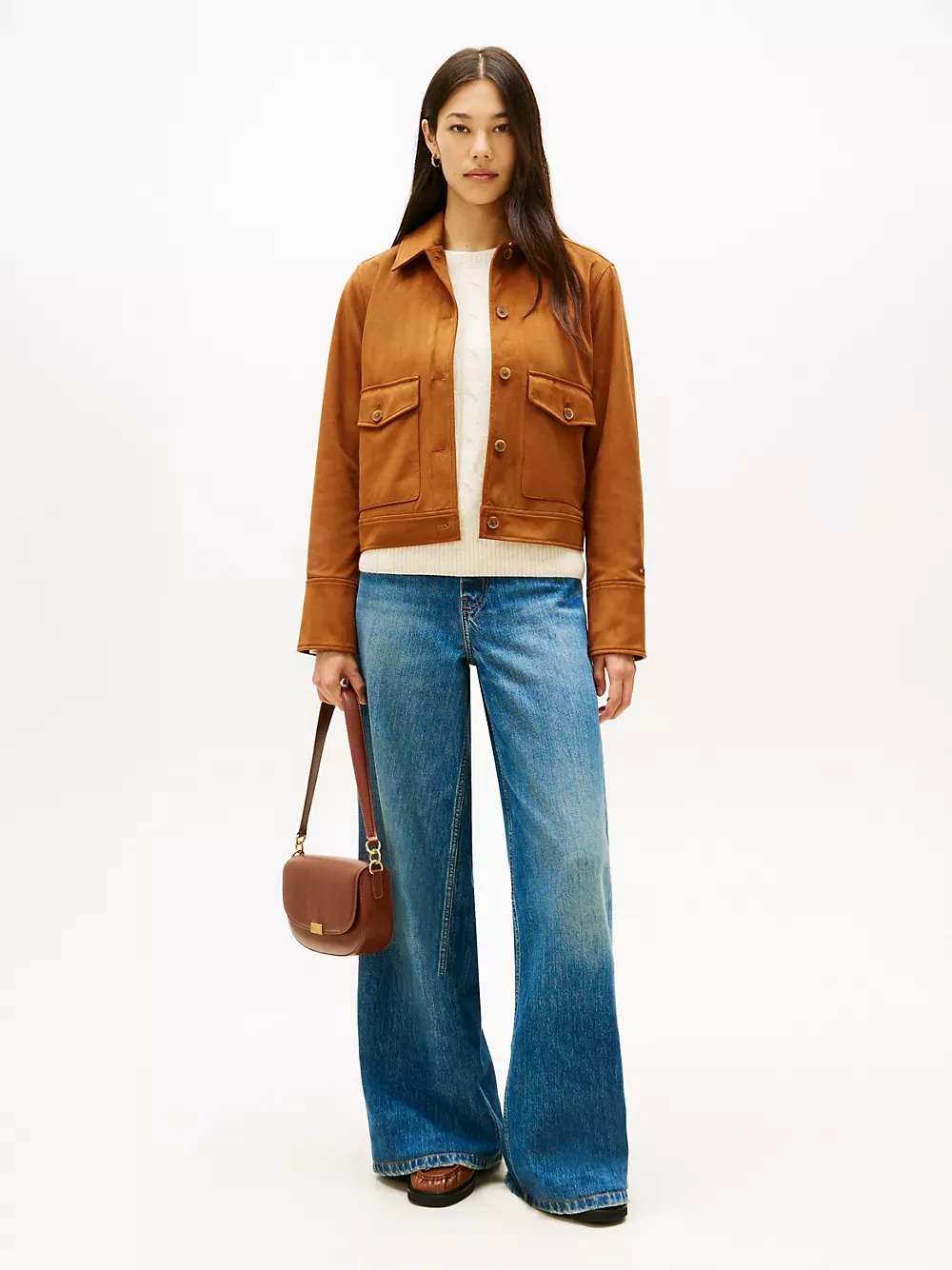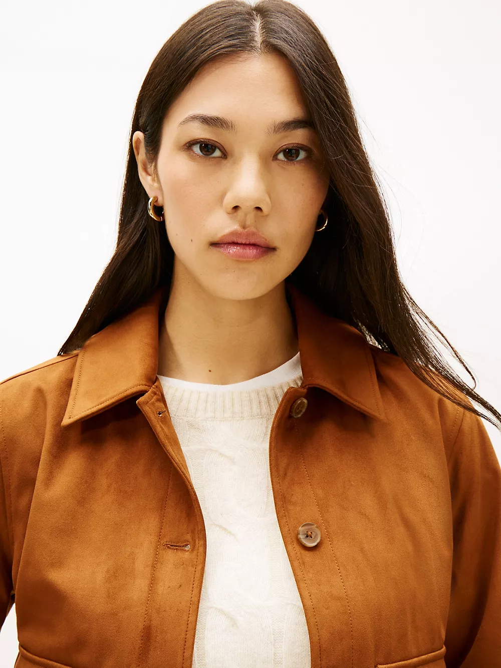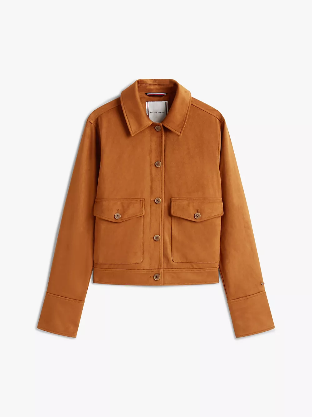 Tommy Hilfiger women's jacket. This cropped jacket features a collared neckline, full button placket and two handy front pockets. With a soft, brushed finish mimicking suede's textural appeal, our version is easy to clean and easy to wear.