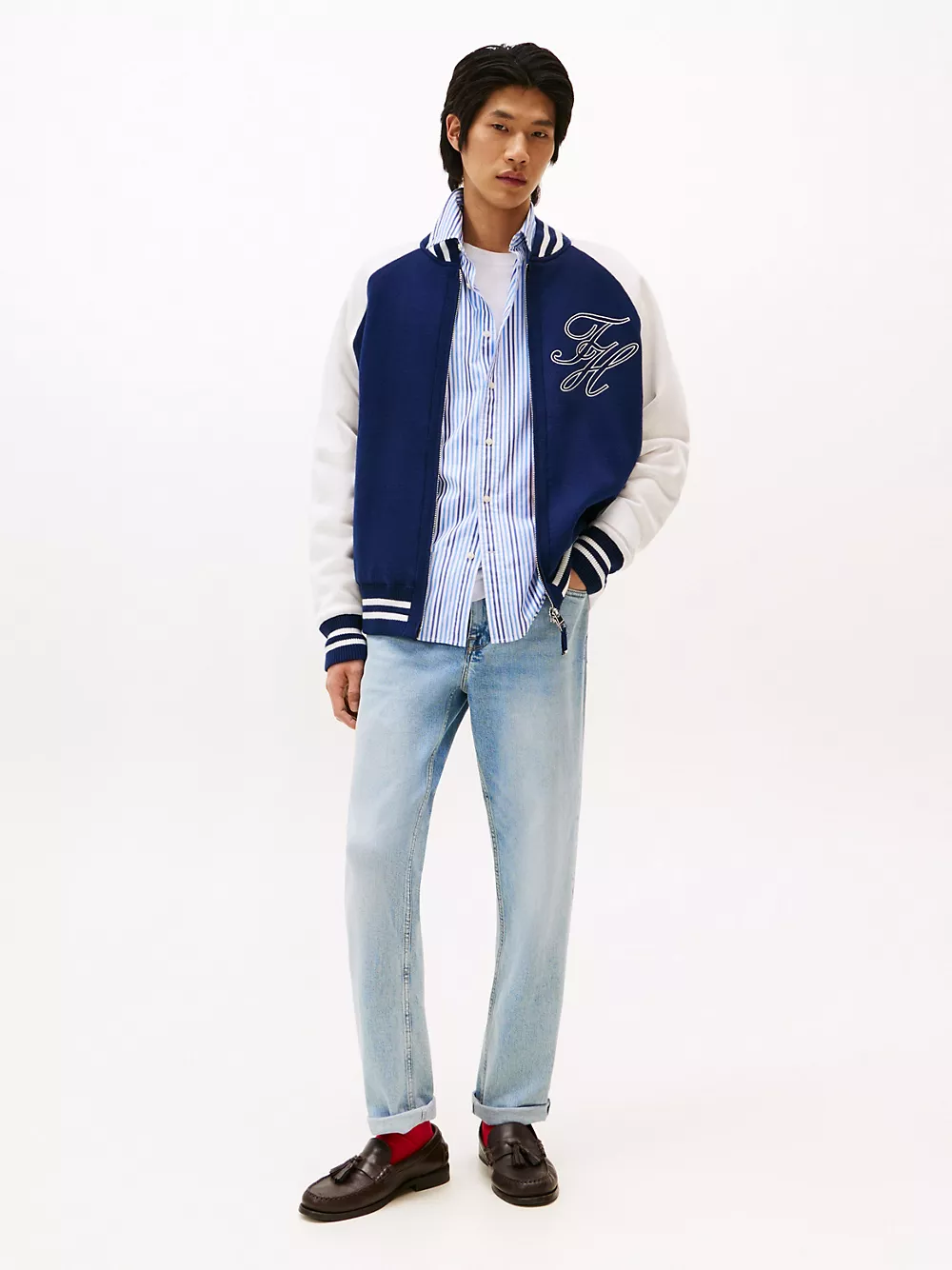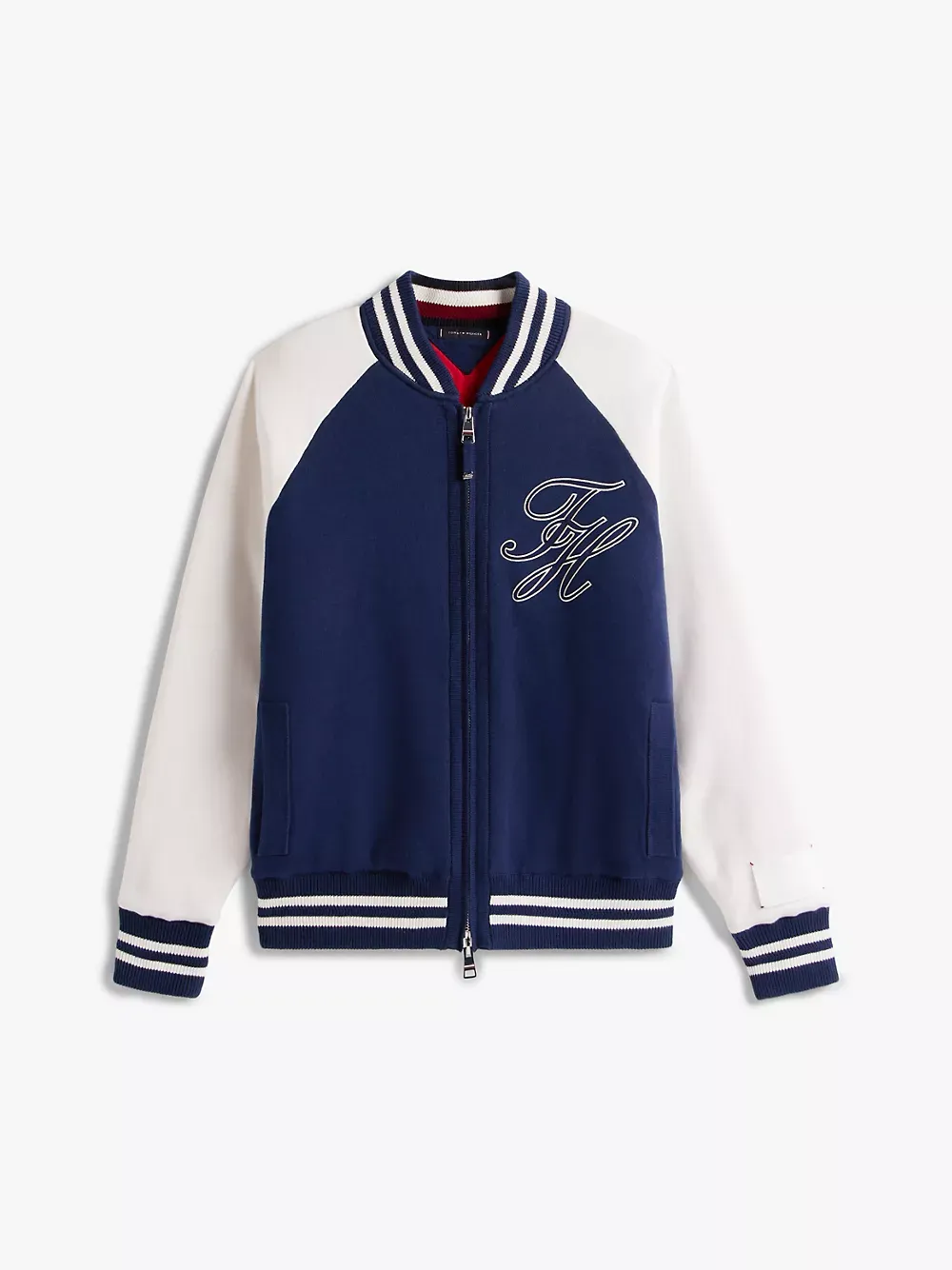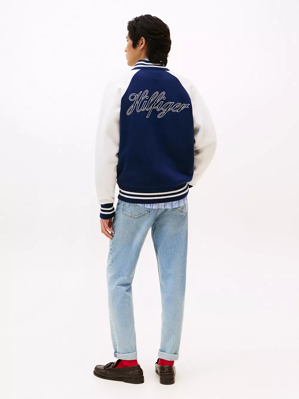 Tommy Hilfiger men's jacket. Our jacket merges the comfort and movement of a sweater with the sporty feel of a bomber. Made from cotton knit with a touch of cashmere, this outer layer is super soft. Raglan colorblock sleeves and our embroidered monogram add to the varsity vibe.