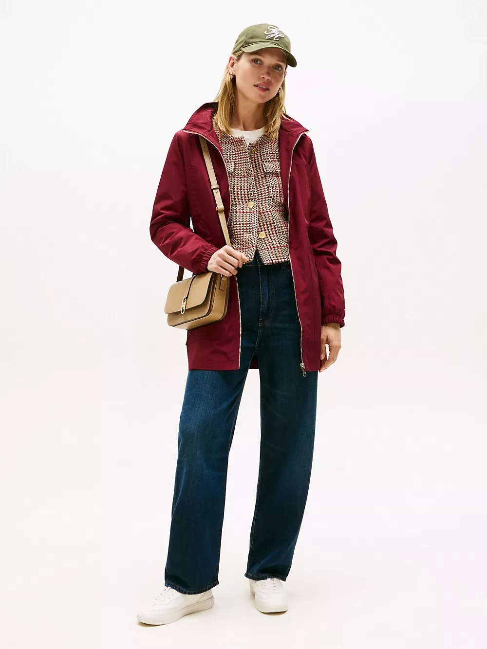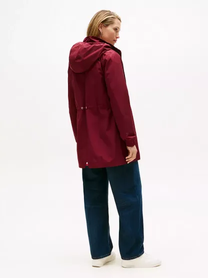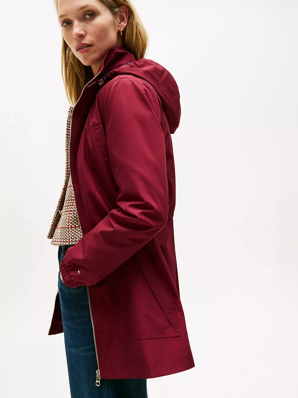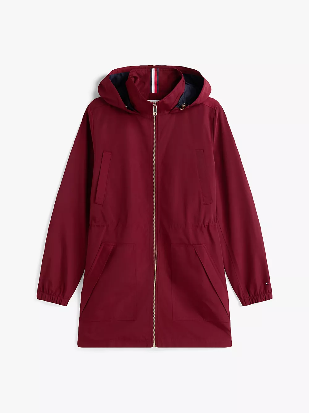 Tommy Hilfiger women's jacket. Our lightweight jacket keeps you covered, thanks to the longline silhouette and bungee drawstring hood. Elastic cuffs and and a channeled bungee waist protect from cool breezes during transitional weather days.