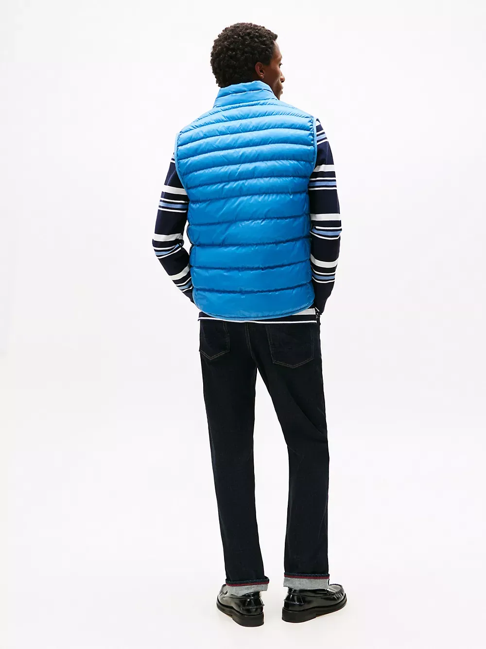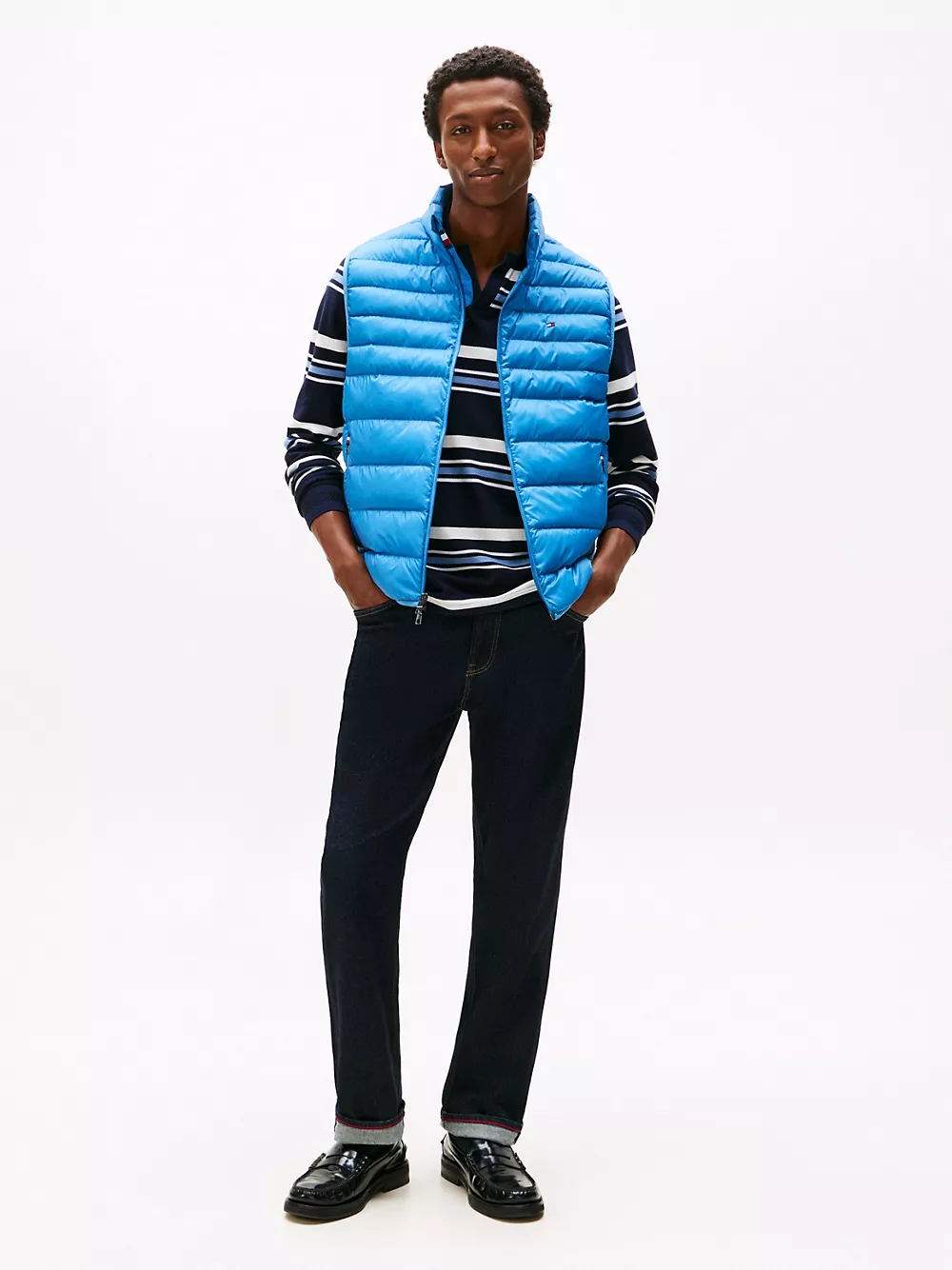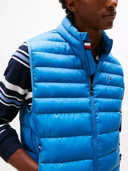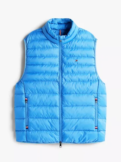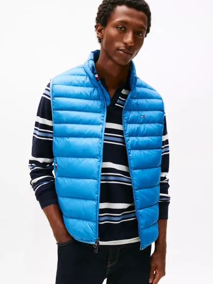Tommy Hilfiger men's vest. Ideal for travel, this puffer vest folds down to a fraction of its size and easily stores in the internal security zip pocket. Made from lightweight fabric and toasty insulation, it's ready for whatever the weather report is dishing out.