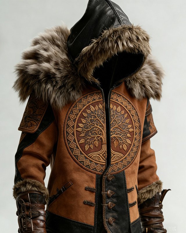 Men's winter Nordic Viking style life-themed three-dimensional embroidered thick and warm over coat 2936