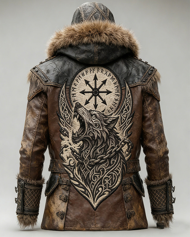 Men's winter Nordic Viking style tribal wolf totem 3D embroidery thickened warm coat 7644