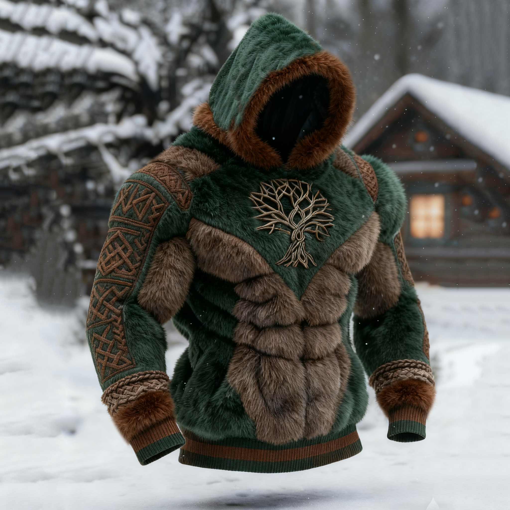 Men's Viking Tribal Jacquard Tree Of Life Muscle Line Inspired Art Plush Warm Hoodie