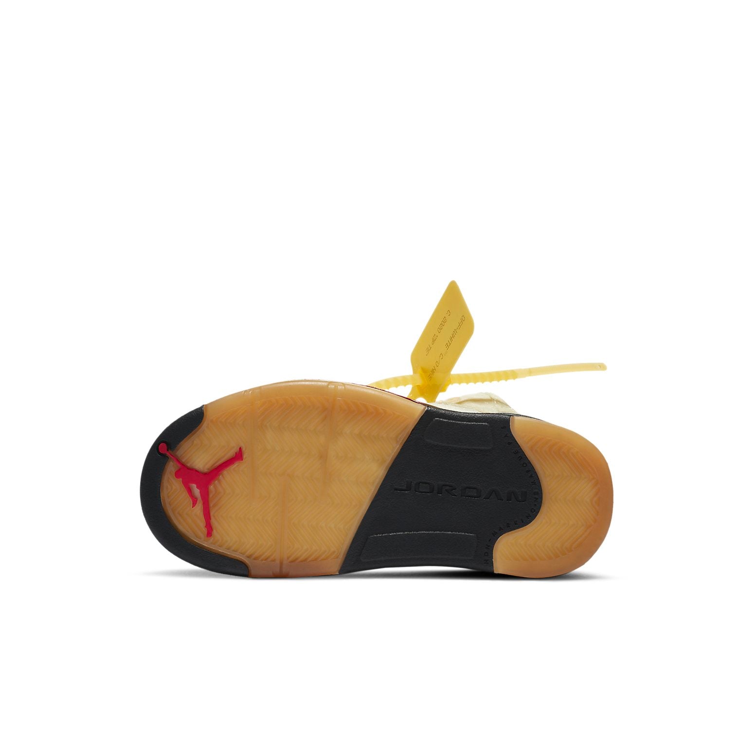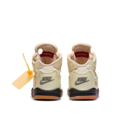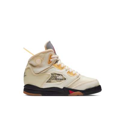 The Air Jordan 5 Retro SP PS 'Sail' is a special edition shoe made for little kids by world-renowned designer Virgil Abloh. This unique take on the classic Retro 5 model features semi-translucent textile in an ivory hue, with a reflective silver finish on the tongue. The left tongue boasts a large circular cut-out, and these same details can be seen on the midfoot and collar. Other signature Virgil touches include a plastic zip tie and lines of Helvetica text on the medial quarter panel. To top it all off, this sneaker sits atop a pre-yellowed translucent rubber outsole for grippy traction no matter where you go.