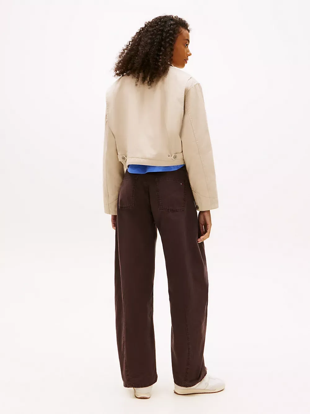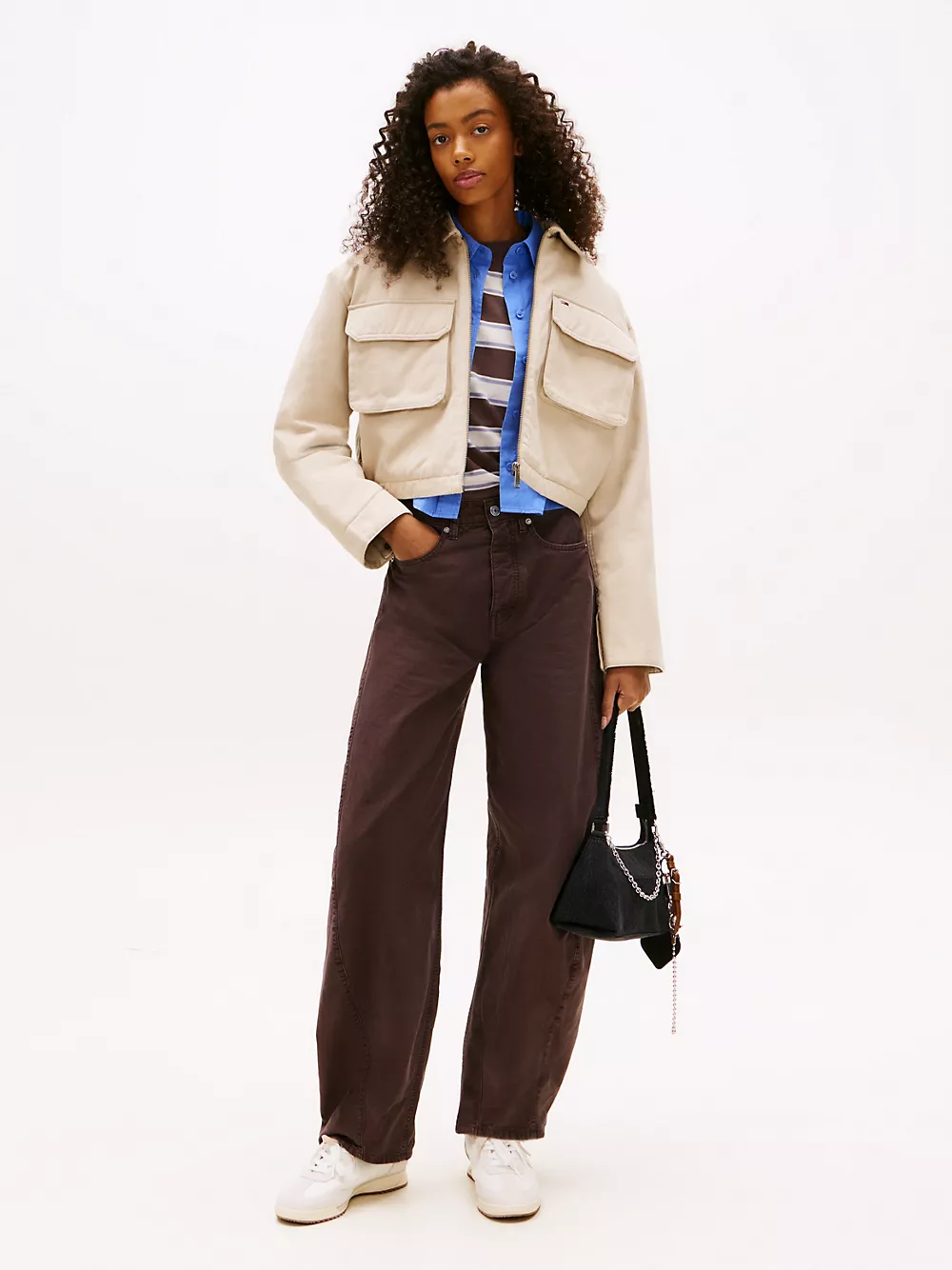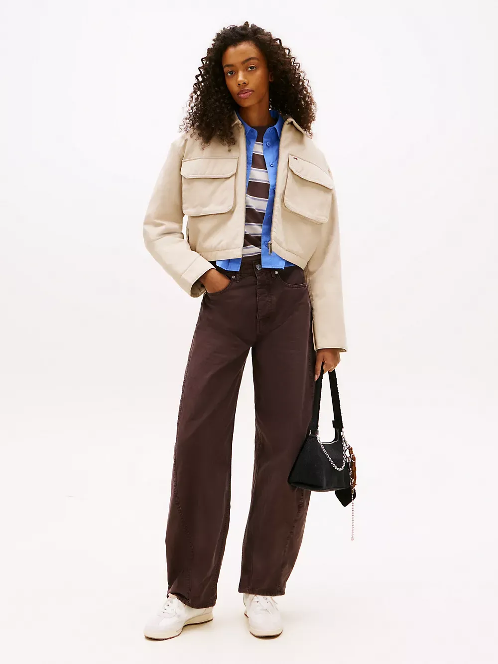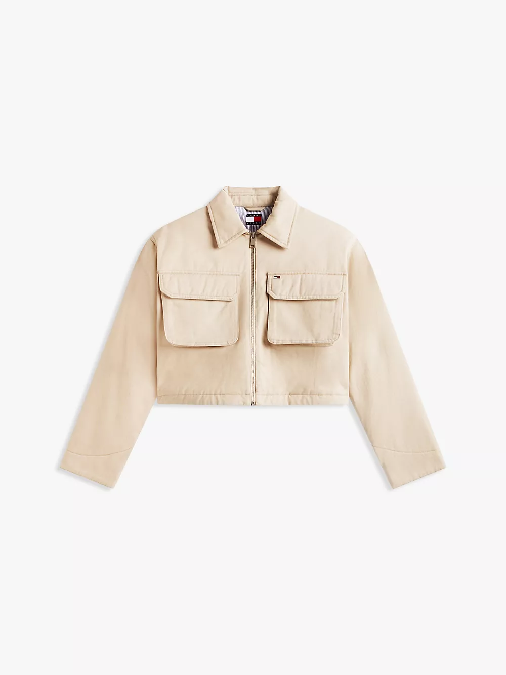Tommy Hilfiger women's jacket. This workwear-inspired twill jacket is designed with a front zip closure and flap pockets at the chest. This version is made with padded insulation to keep you warm as the temps drop. Part of our Tommy Jeans collection.