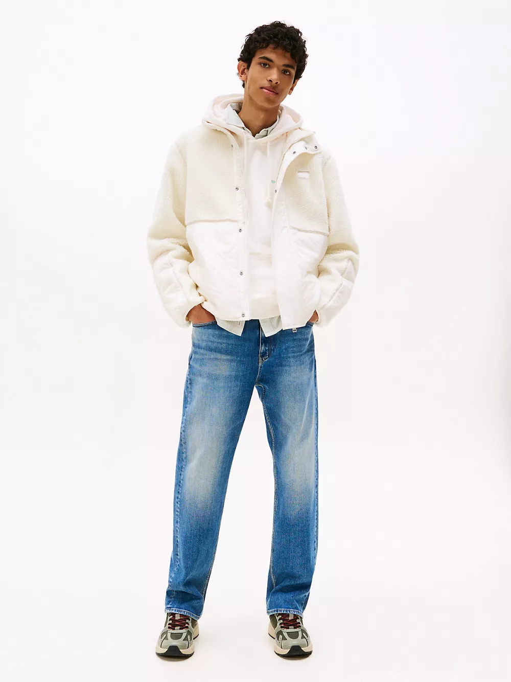 Tommy Hilfiger men's jacket. Ideal for the changing seasons, this relaxed-fit jacket combines a plush teddy finish with quilted panels for warmth when the temperature drops. Part of our Tommy Jeans collection.