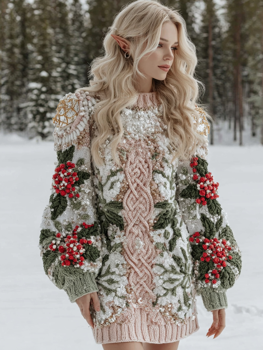 Women's Christmas Floral Holly Berry Celtic Knot Midi Sweater Dress