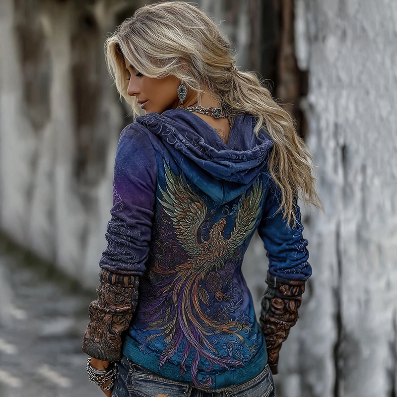 Women's Viking Mythology Phoenix Embroidery Comfortable Warm V-neck Hoodie