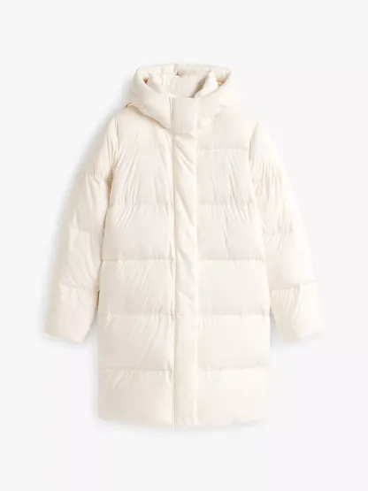 Tommy Hilfiger women's coat. Heritage style meets contemporary construction in this puffer coat, made chill-proof thanks to the down insulation, a high funnel neck and a fixed hood. This iteration is designed in a midi silhouette, intended to finish close to the top of the knee.