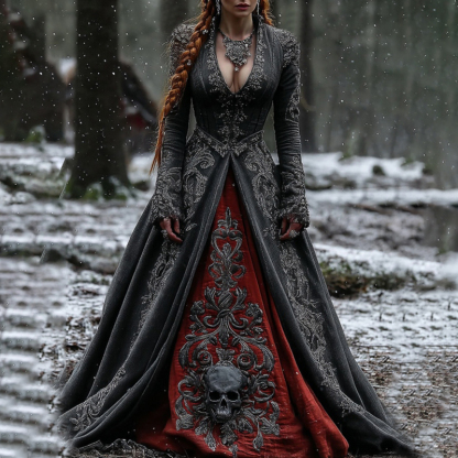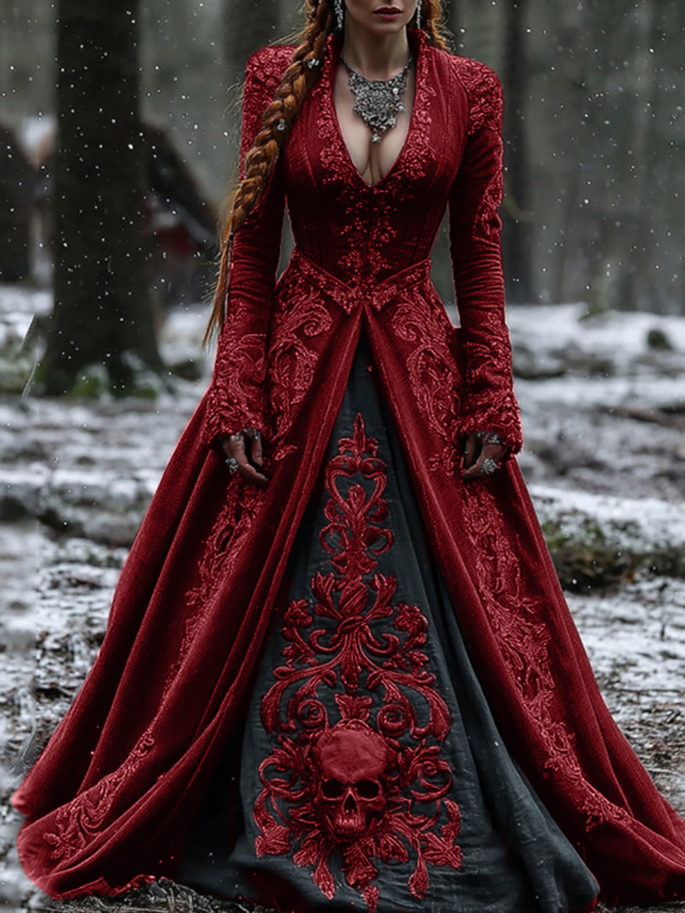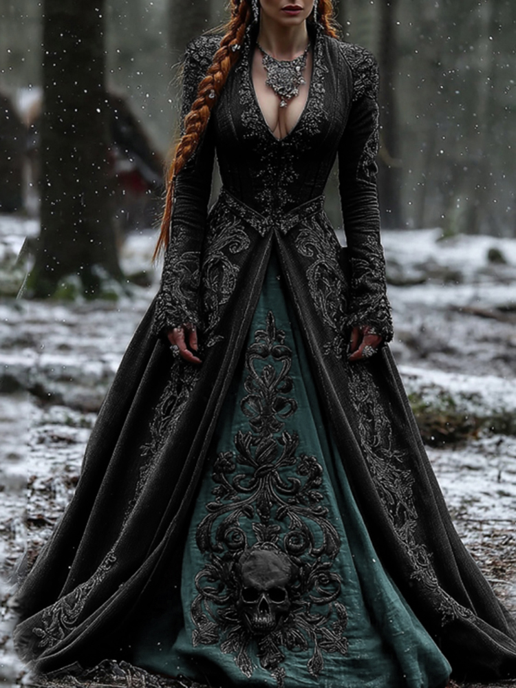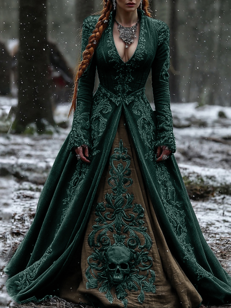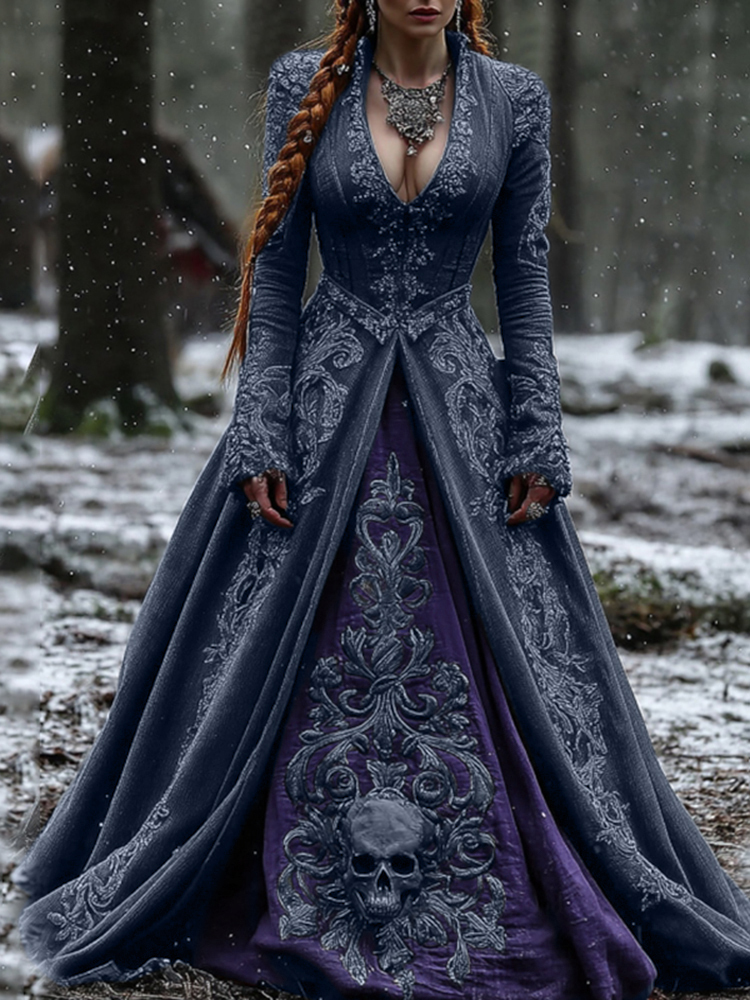 Women's Vintage Viking Skull Embroidery V Neck Casual Maxi Dress