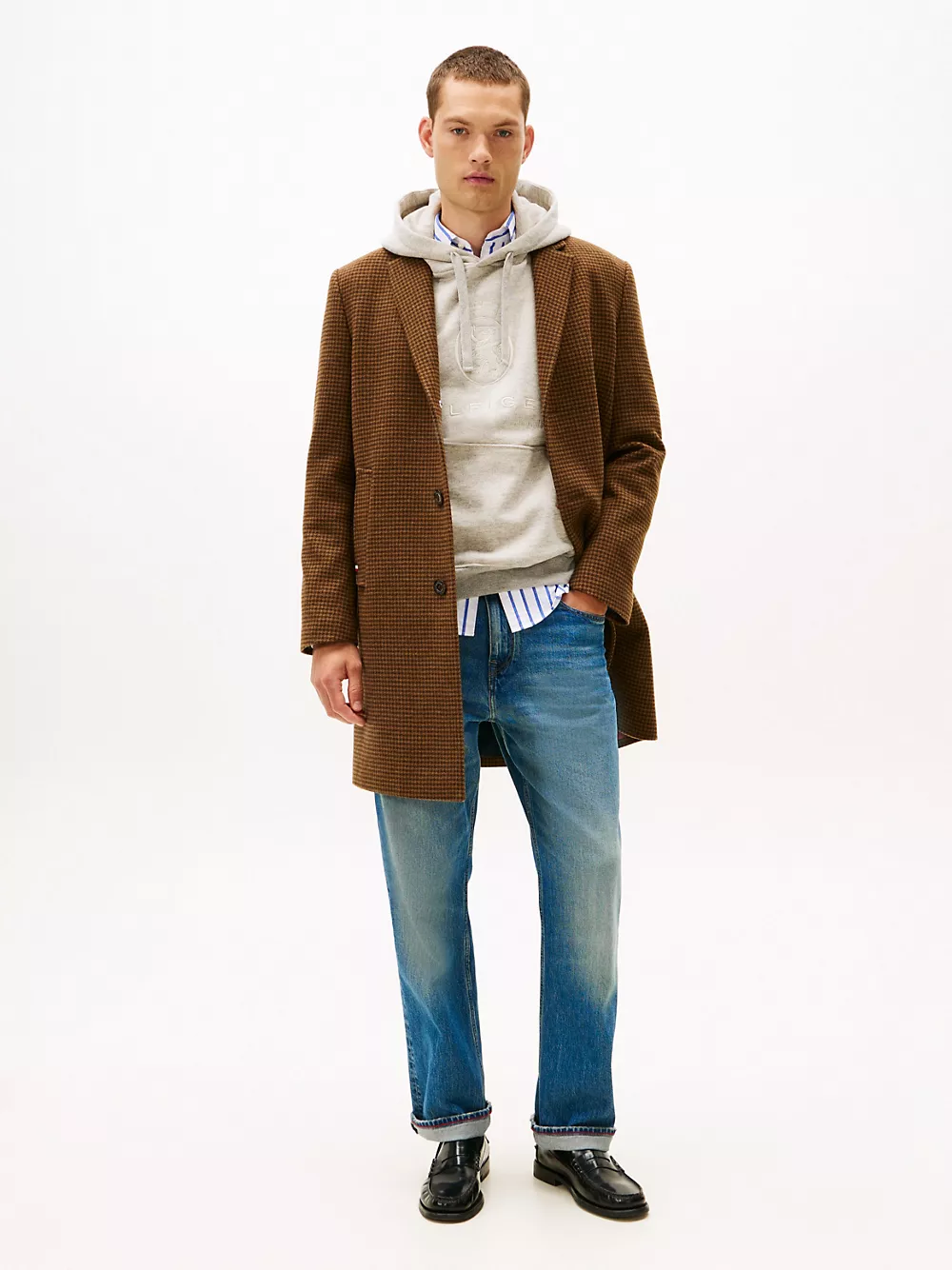 Tommy Hilfiger men's coat. Our houndstooth coat is made from a wool blend for warmth and durability. Designed with notched lapels and classic lines, it pairs effortlessly with both casual and elevated looks.